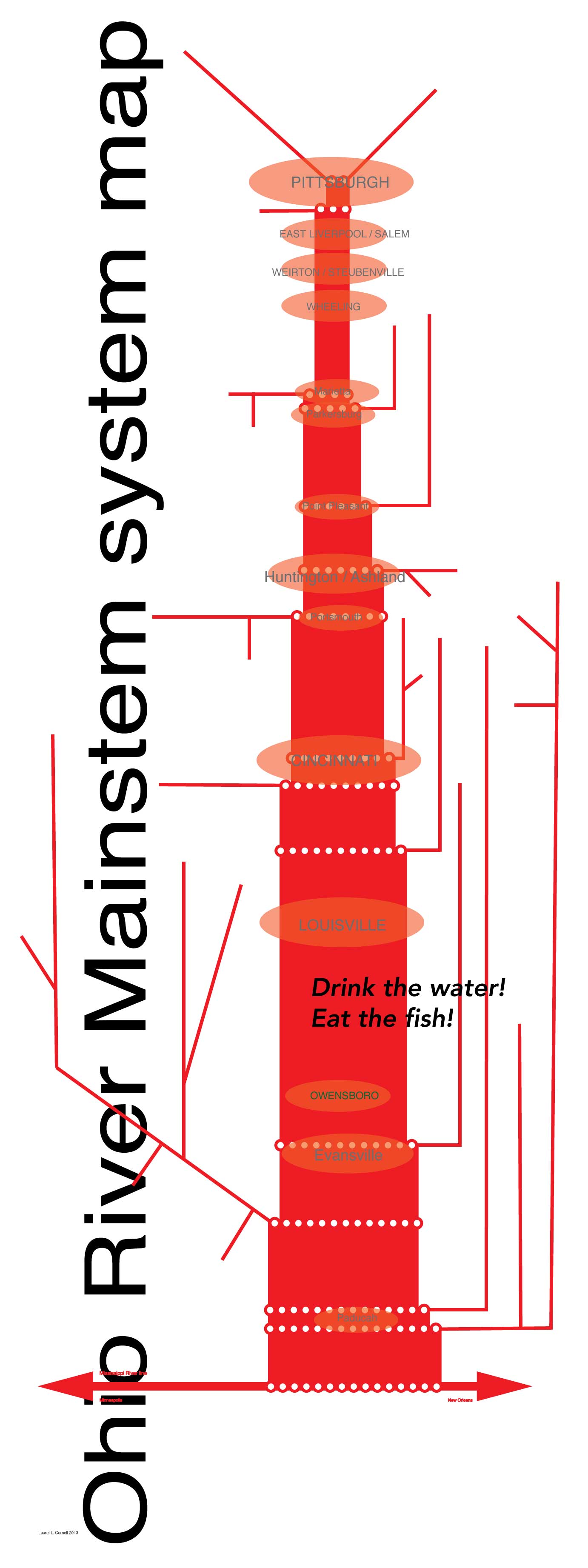 The Ohio River is one of the largest rivers in the United States. It draws its water from most of the eastern United States. It is bounded on the north by the Great Lakes watershed, on the east by the Mid-Atlantic watershed, on the south by the South Atlantic Gulf watershed, and on the west by the upper and lower Mississippi watersheds. It is the largest tributary of the Mississippi River, which drains the center part of the North American continent. Where it joins the Mississippi, the Ohio is the larger river. Water from the Ohio, and the chemicals and nutrients carried by that water contribute to the dead zone in the Gulf of Mexico. How can we think of the Ohio River? What kind of place is it? What kind of landscape is it? Take a look at the Ohio River Mainstem system map.