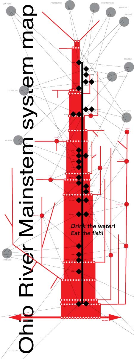 Coal is moved from coal fields in Indiana, Illinois, Kentucky and West Virginia up and down the river to coal-fired power plants on the riverbank. These coal-fired power plants, fueled by high sulfur coal, are one of the major sources of air pollution in the eastern United States. Ironically, these coal plants also are the source for much of the electricity in the eastern United States. If you are reading this page in the United States anywhere east of the Mississippi River it is likely that you are using energy generated by a coal-fired power plant along the Ohio River. Luckily, since 1998, the date for the list of the power plants on the print, several of the coal-fired power plants along the Ohio have been demolished or replaced by other fuel sources.
